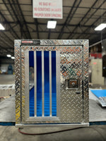 Hunter Series Single Compartment Dog Box. This single compartment dog box features a rugged diamond tread aluminum construction. Dog compartment is lined with plastic corrugate. Lockable slam latch door with storm cover is slotted for a crate cooling fan. Vented with all seasons oversized side (12 x 30) vents for maximum air flow with storm covers. Premium rattle-free spring loaded carrying handles. D-rings that can be utilized to strap down in your vehicle. All measurements are in Inches.