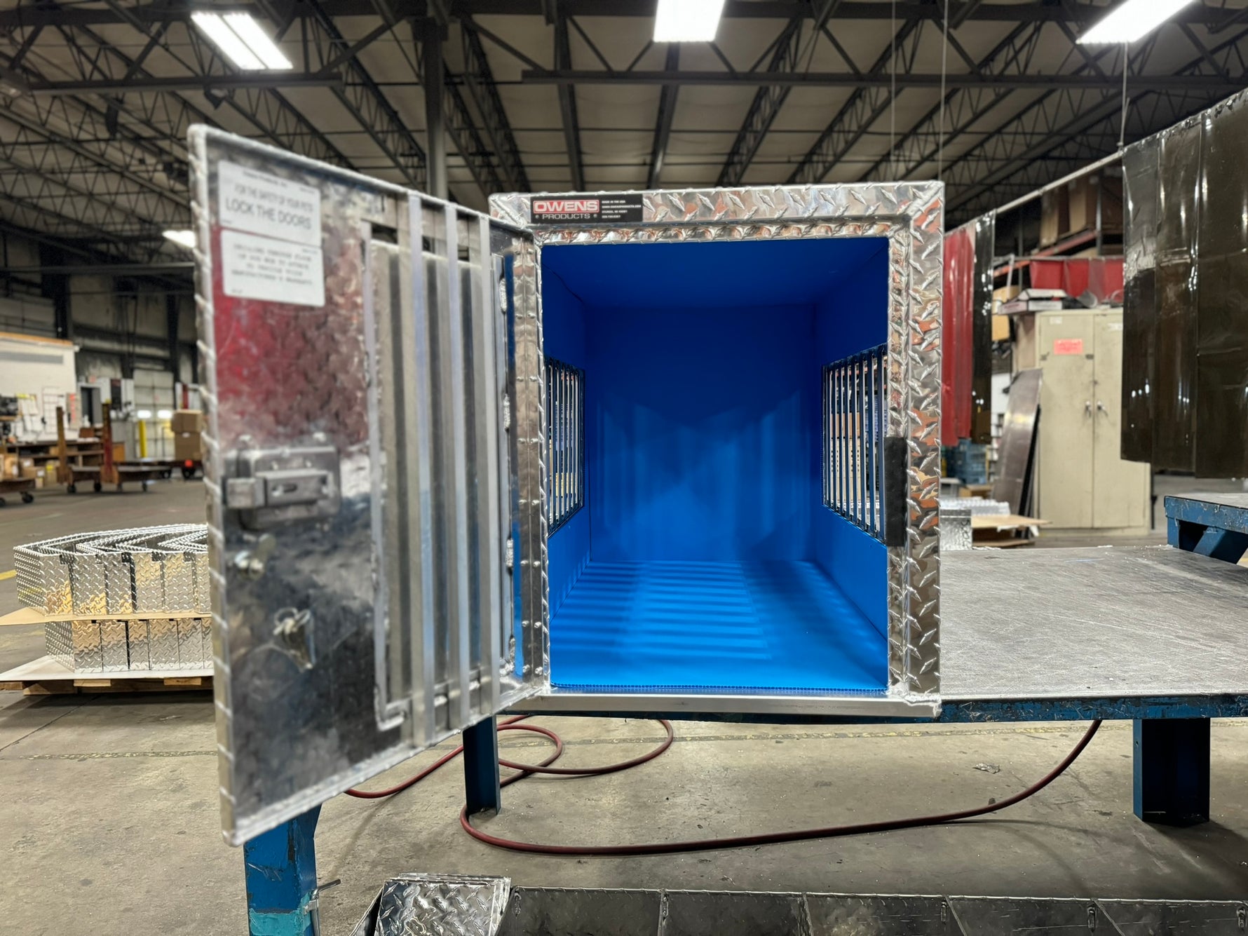 Our Hunter Series Dog Boxes feature a rugged diamond tread aluminum construction, large lined dog compartments with lockable slam latch doors, either with Standard Vents or All Seasons Vents for maximum air flow. Owens Products Hunter Series Dog Boxes are available in single, double or triple compartments, with or without top storage.