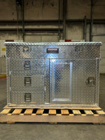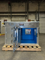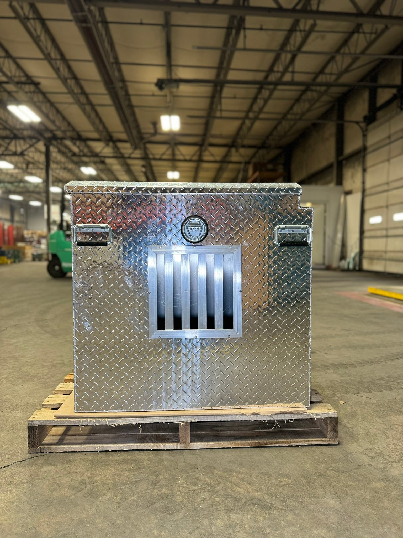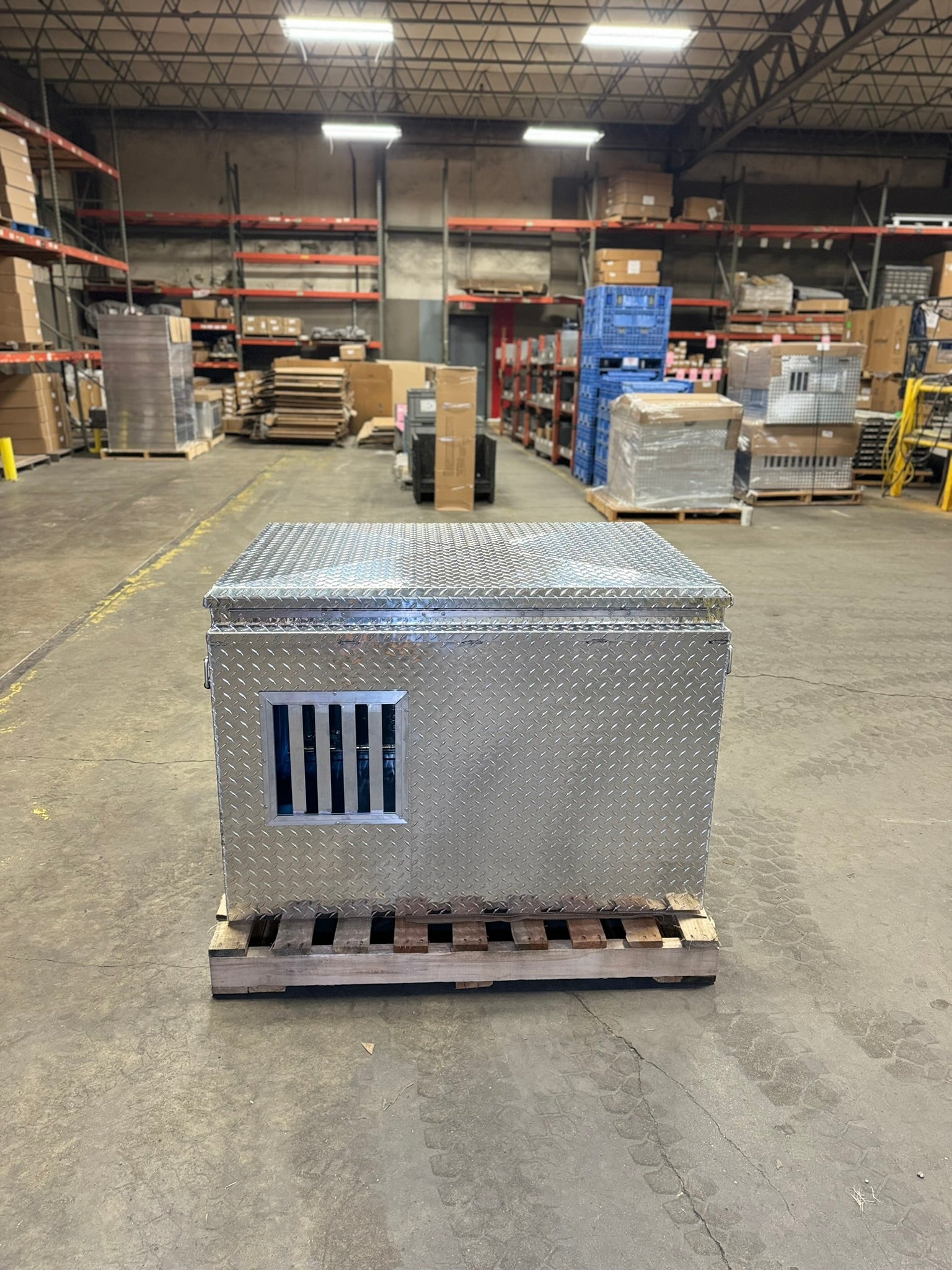 Hunter Series Double Compartment Dog Box with Top & Side Storage. Features a rugged diamond tread aluminum construction with one dog compartments lined with plastic corrugate. Full length lockable top and side storage compartment for valuables such as guns, electronics and hunting gear. Top storage is easy to close with the Owens Pull Strap. T-handle lock doors with storm covers slotted for crate cooling fans. Vented with all season vents for air flow with storm covers. Center divider has air holes for cross ventilation between the compartments. Premium rattle-free spring loaded carrying handles. D-rings that can be utilized to strap down in your vehicle. All measurements are in Inches.