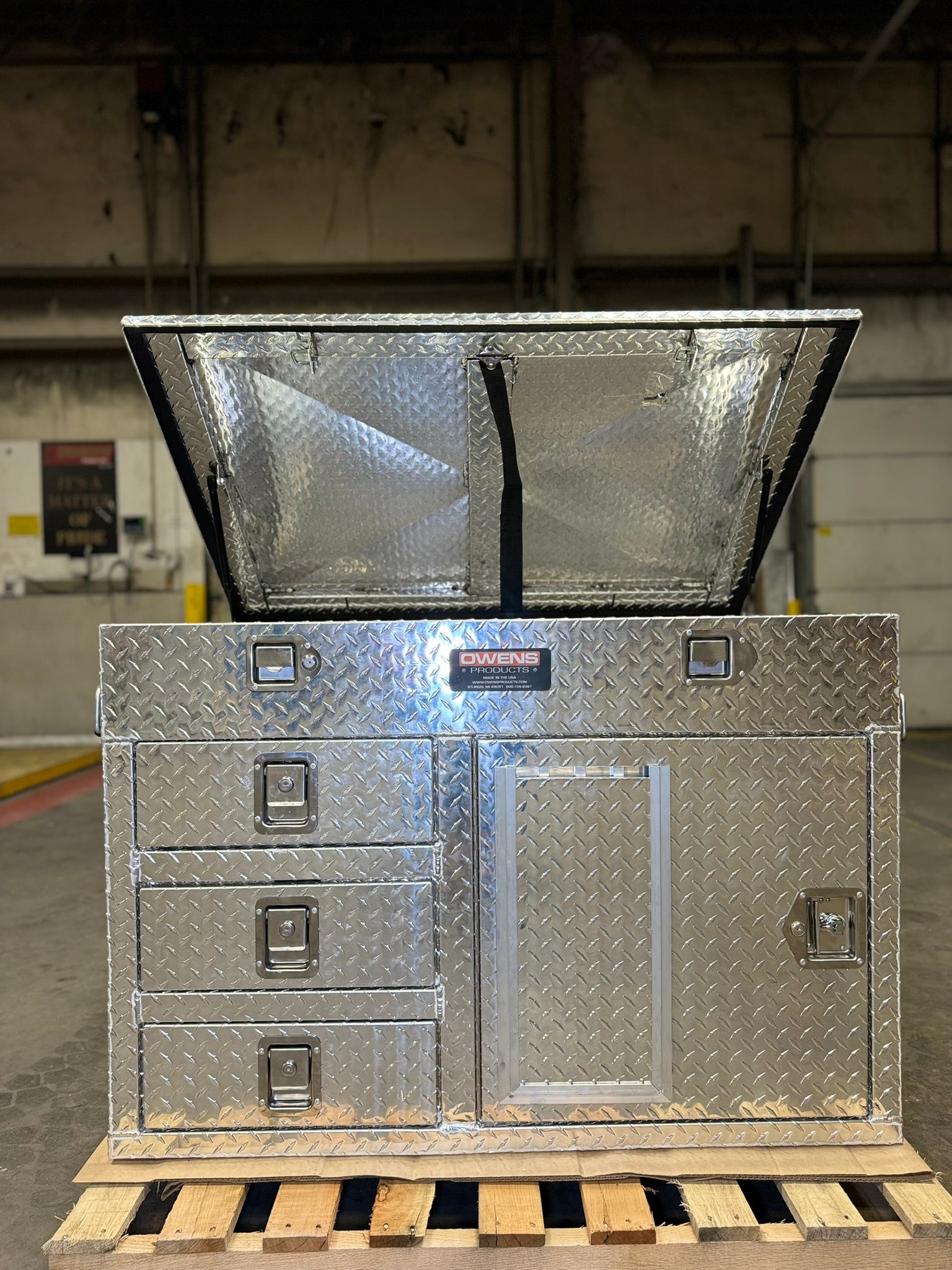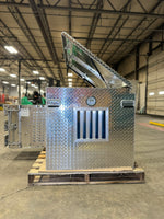 Hunter Series Dog Boxes feature a rugged diamond tread aluminum construction, large lined dog compartments with lockable slam latch doors, either with Standard Vents or All Seasons Vents for maximum air flow. Owens Products Hunter Series Dog Boxes are available in single, double or triple compartments, with or without top storage.